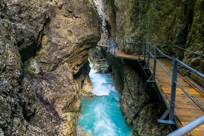 Die enge Leutascher Geisterklamm kann über Brücken, Pfade und Felssteige erwandert werden und liegt bei Mittenwald im bayerisch-tirolischen Grenzgebiet. Durch die wildromantische Klamm führen drei Routen. Der Koboldpfad ist 1,9 Kilometer lang und vermittelt anhand von Infotafeln Einblicke in die Geologie. Der Wasserfallsteig führt 200 Meter durch die Schlucht und endet an einem 23 Meter hohen Wasserfall.